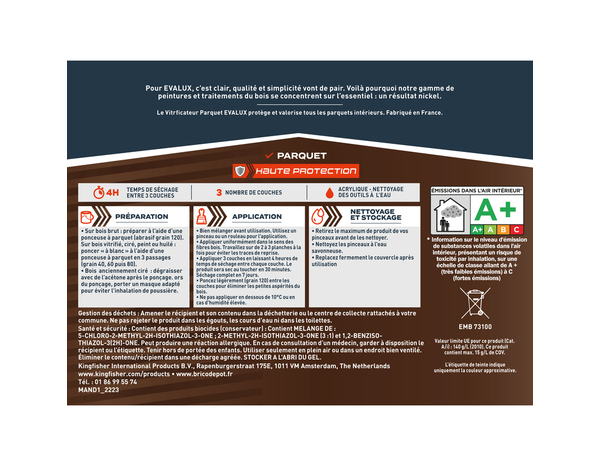 Le Vitrificateur incolore - 2,5 L mat pour tous types de bois, il est résistant aux rayures et aux tâches. Couleur : transparent Finition : mat. Application au pinceau ou rouleau. Temps de séchage : 4 heures. Usage : intérieur. Tous types de bois. Surface de couverture : 7,5 m² Informations fournisseurs : Nom : Kingfisher International Products B.V. Adresse : Rapenburgerstraat 175E, 1011 VM Amsterdam, The Netherlands Site web : www.kingfisher.com/products