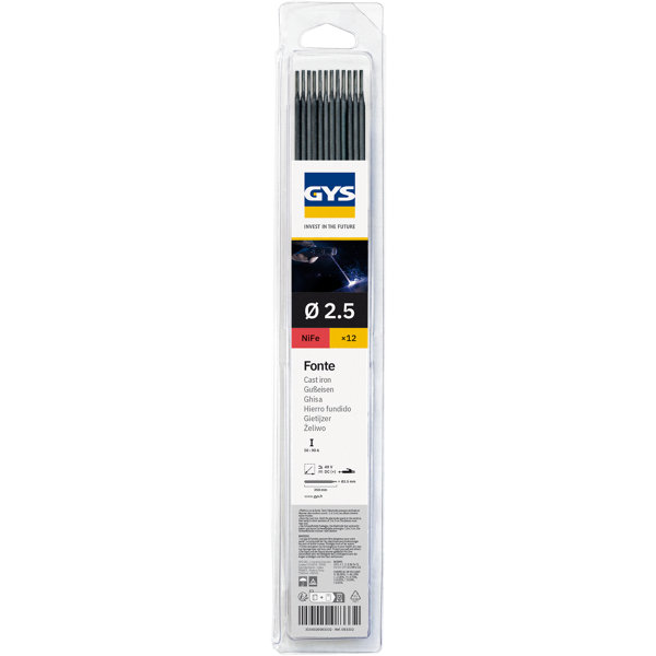 Lot de 12 électrodes enrobées fonte diamètre 2,5 mm spécialement conçues pour la réparation des fontes, d’un diamètre de 2,5 mm adapté aux travaux de précision.