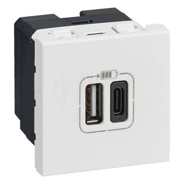 Double chargeur USB Type-A + Type-C Mosaic 3A 2 modules. Peut recharger simultanément 2 équipements : téléphone, smartphone, lecteur MP3 ou MP4, appareil photo, manette de jeux, GPS mais également 1 tablette PC (charge rapide). 1 port Type-A et 1 port Type-C pour charge rapide.
