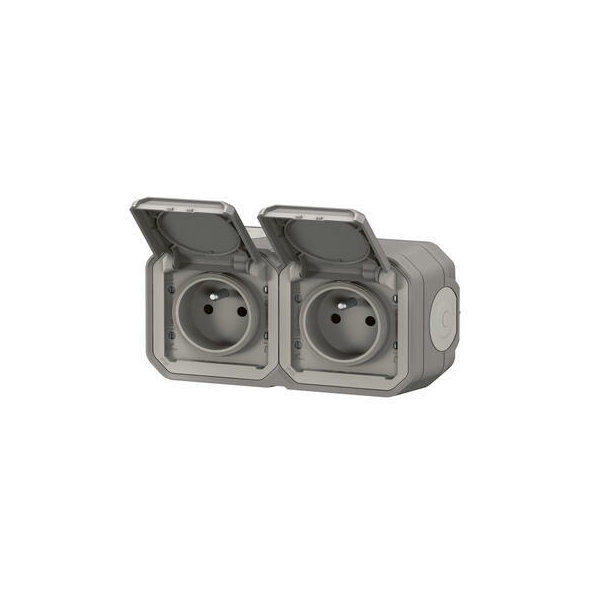 Double prise de courant verticale avec volet "Plexo" complet saillie - Gris