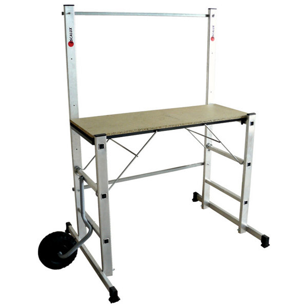 Modèle "HORTUS 90". En aluminium. Hauteur de travail : 3,10 m. Grand plateau 110 x 41 cm, positionnable à 2 hauteurs différentes (60 et 90 cm). Roulant : grande roue gonflable. 2 larges bases stabilisatrices pour une utilisation tout-terrain. 1 garde corps. 1 béquille anti-basculement pour aider à la montée. 1 plateau aggloméré hydrofuge sur un robuste cadre en acier. Garantie 2 ans(A).