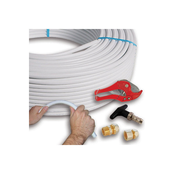 Flexible multicouche blanc de diamètre 16 mm, idéal pour les installations de plomberie intérieure et extérieure. Adapté à tous types de raccords à visser ou à sertir, il assure une grande compatibilité avec les outils de sertissage. Résistant aux températures de 5°C à 100°C et à une pression maximale de 10 bar, il convient aussi bien pour l'eau chaude sanitaire que pour le chauffage. Sa structure semi-flexible permet un cintrage manuel tout en conservant sa forme, grâce à une barrière anti-oxygène intégrée. Ce tube multicouche est garanti 10 ans, certifié ACS et propre à la consommation d'eau potable.
