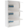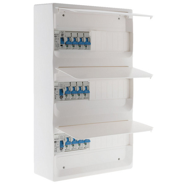 Équipé de 3 interrupteurs différentiels NF 30mA : 2 x 40A (1 type A + 1 type AC) + 1 x 63A type AC et de 12 disjoncteurs NF (3 x 10A, 4 x 16A, 4 x 20A, 1 x 32A). Fourni avec rail métal, obturateurs, étiquettes de repérage de circuit, autocollant pour plan de câblage et 3 portes blanches.
