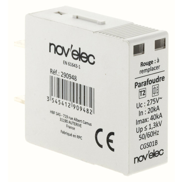 Pour parafoudre 820950. Obligatoire selon la norme NF C15-100 dans les régions à forte densité d’impacts de foudre. Le parafoudre limite les surtensions en évacuant l’énergie vers la terre. Parafoudre monophasé. Niveau de protection 40kA. Si le voyant de la cartouche est rouge, celle-ci est à remplacer (vendue seule). Caractéristiques techniques de la cartouche : Uc 275V~ / In 20kA / Imax 40kA / Up ≤ 1.3kV / 50/60Hz.