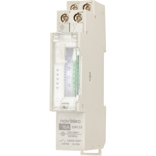Horloge analogique journalière Novelec, idéale pour automatiser l’allumage et l’extinction de vos circuits électriques selon un programme sur 24 heures. Son design blanc mat s’intègre facilement dans tout type d’installation modulaire. Fiable et pratique, elle dispose d’une réserve de marche de 100 heures pour assurer le maintien du programme en cas de coupure de courant. Fabriquée en France par HBF, elle bénéficie d’une garantie fabricant de 2 ans. Un outil simple et efficace pour gérer vos équipements électriques au quotidien.