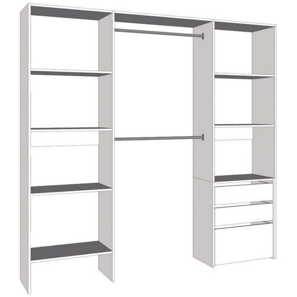 Modèle Mobil. Dimensions : H. 200,3 cm x L. de 120 à 200 cm x P. 40 cm. En PPSM*. Ep. 16 mm, coloris blanc. Composé de : 2 colonnes, larg. 60 cm, 1 bloc de 3 tiroirs (H. 70 x L. 58,4 x P. 40 cm) positionnable dans la colonne centrale ou dans la colonne de droite, 7 tablettes, 2 barres de penderie larg. 80 cm, recoupables.