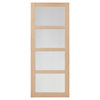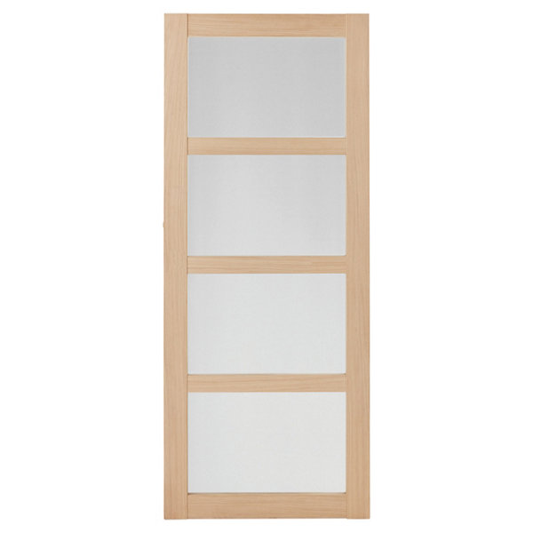 Haut. 204 cm. Larg. 83 cm. Huisserie 72 x 40 mm. Montants, traverses et huisserie MDF** plaqués chêne. Âme pleine plaquée chêne naturel. Verre dépoli ép. 4 mm. Existe aussi avec panneaux pleins. Vendue sans poignée. À vernir