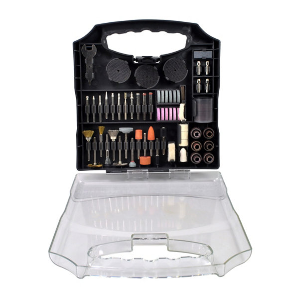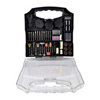 6 bandes de ponçage 6,35 mm, 6 bandes de ponçage 12,7 mm, 1 pointe de disque en feutre, 36 disques de coupe réguliers, 3 disques de coupe en fibre de verre, 1 mandrin pour disque en feutre, 1 clé, 4 bagues chromées, 4 disques en feutre, 2 tiges de ponçage, 3 mandrins pour disque de coupe, 6 fraises en diamant, 1 fraise HSS, 6 pinceaux axiaux, 3 roues de polissage orange en oxyde d'aluminium avec tige, 6 roues de polissage rose en oxyde d'aluminium, 2 roues de polissage en carbure de silicium vertes avec tige, 6 roues de polissage en carbure de silicium vertes, 1 meule en carbure de silicium, 1 disque émeri en caoutchouc et 1 disque de toile de polissage.