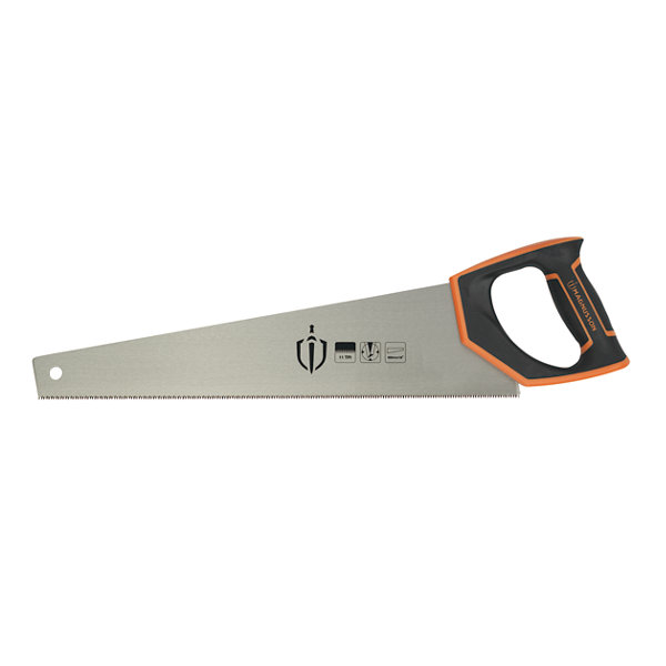 Dimensions du produit (L. 565 x l. 150 x H. 35 mm). Sciage par mouvement de va-et-vient. Dents à triple bordure, denture 11 TPI. Traitement thermique. Lame en acier trempé par induction, ép. 0,9 mm. Poignée bi-matière. Utilisation pour : branches, bois brut et bois vert. Porter des lunettes de protection.