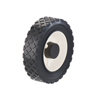 Pneu caoutchouc PVC injecté Ø 150 mm, largeur bande de roulement 38 mm, palier lisse Ø12 mm. Longueur du moyeu 34 mm. Centre PP blanc, bande de roulement PP noir. Charge maxi 35 kg. Pour tondeuse. Usage extérieur.