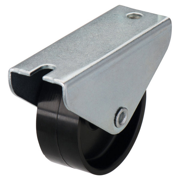 Roulette fixe Ø45 mm, monture zinguée, roue nylon noir, charge maxi 40 kg, fixation platine 67 x 24 mm pour tiroir coulissant. Usage intérieur. Garantie 2 ans.