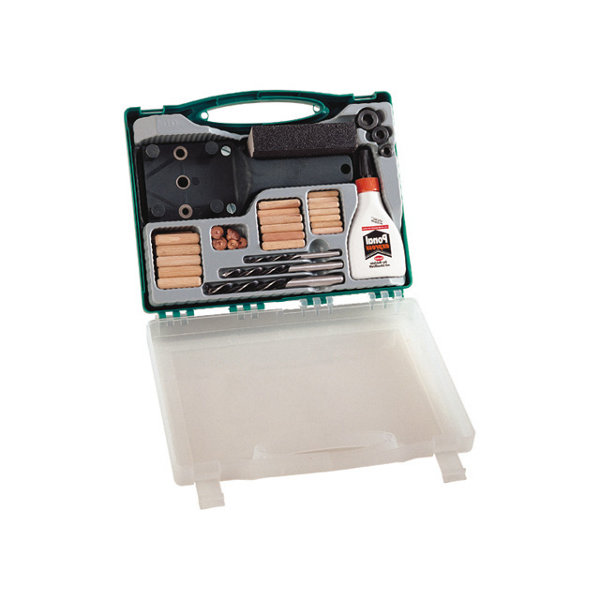 - Contenu : 1 guide de perçage (Ø 6, 8, 10 mm), 3 forets bois (Ø 6, 8, 10 mm), 3 butées de profondeur, 3 paires de centreurs (Ø 6, 8, 10 mm), lot de tourillons (6, 8, 10 mm)