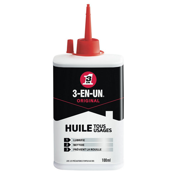 3-EN-UN ORIGINAL Huile Tous Usages 100 mlc’est l’huile célèbre et authentique qui convient à de multiples utilisations. Sa formule à base d’huile minérale permet de lubrifier efficacement les mécanismes, supprimer les grincements, nettoyer le métal, tout en les protégeant de la rouille et la corrosion.