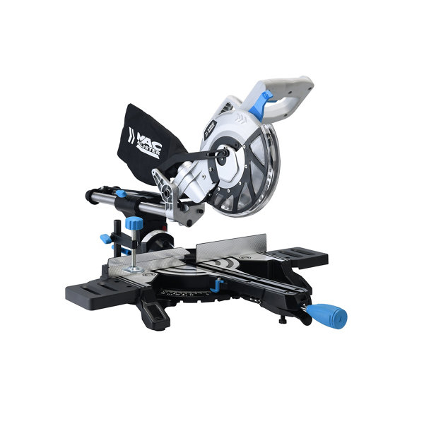 Cette scie à onglet radiale Mac Allister MMIS210-A 1500W 210 mm. est fournie avec 1 lame 48 dents, sac à poussière, clé mâle, bras d'extension et système coulissant à biseau.