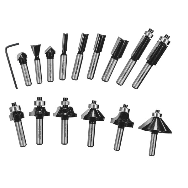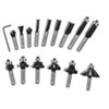 Ensemble complet de 15 fraises pour défonceuse avec tige de 8 mm, idéal pour le rainurage, le profilage et le moulage. Conçues pour une utilisation sur bois tendre et dur, panneaux de fibres à densité moyenne et contreplaqué.