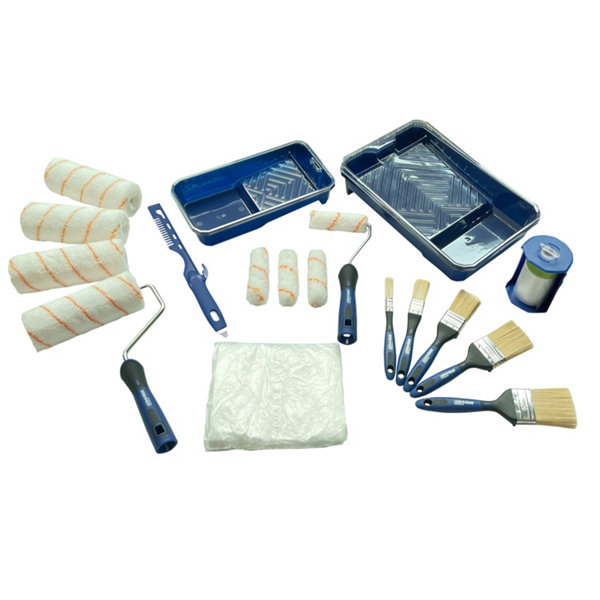 • Le kit de peinture comprend : monture 180mm, 4 manchons pour murs et plafonds 180mm, bac à peinture 180mm, liner pour bac à peinture 180mm, mini monture 100mm et 4 manchons 100mm, bac à peinture 100mm, liner pour bac à peinture 100mm, 5 pinceaux plat 13mm, 25/40/50/60mm, rouleau de bâche de protection avec ruban adhésif et distributeur (550mm x 25m), bâche de protection en plastique 4 x 5m et outil de nettoyage multifonction.