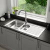 Alliez robustesse et design avec cet évier de cuisine en acier inoxydable Jabiri. Sa finition satinée apporte une touche moderne et élégante à votre plan de travail. Conçu pour durer, il résiste à la chaleur jusqu’à 180°C et aux chocs du quotidien. Son format 1,5 bac avec égouttoir réversible s’adapte à tous les espaces. Facile à installer, il est livré avec raccords et fixations pour un montage en toute simplicité.