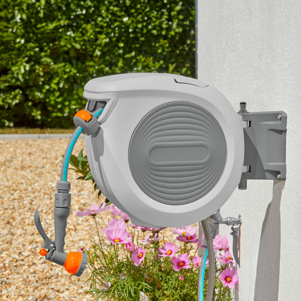 Dévidoir mural automatique gris avec tuyau d'arrosage 20 m et pistolet 7 réglages conçu pour l’arrosage des espaces extérieurs, équipé d’un support pivotant facilitant les mouvements.