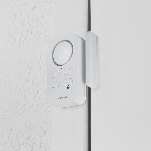 L'alarme peut être activée et désactivée par un code. Sirène 100dB. Sur batterie. 3 Piles AAA incluses. Dimensions: L. 10,2 x l. 7,1 x H. 2,3 cm.